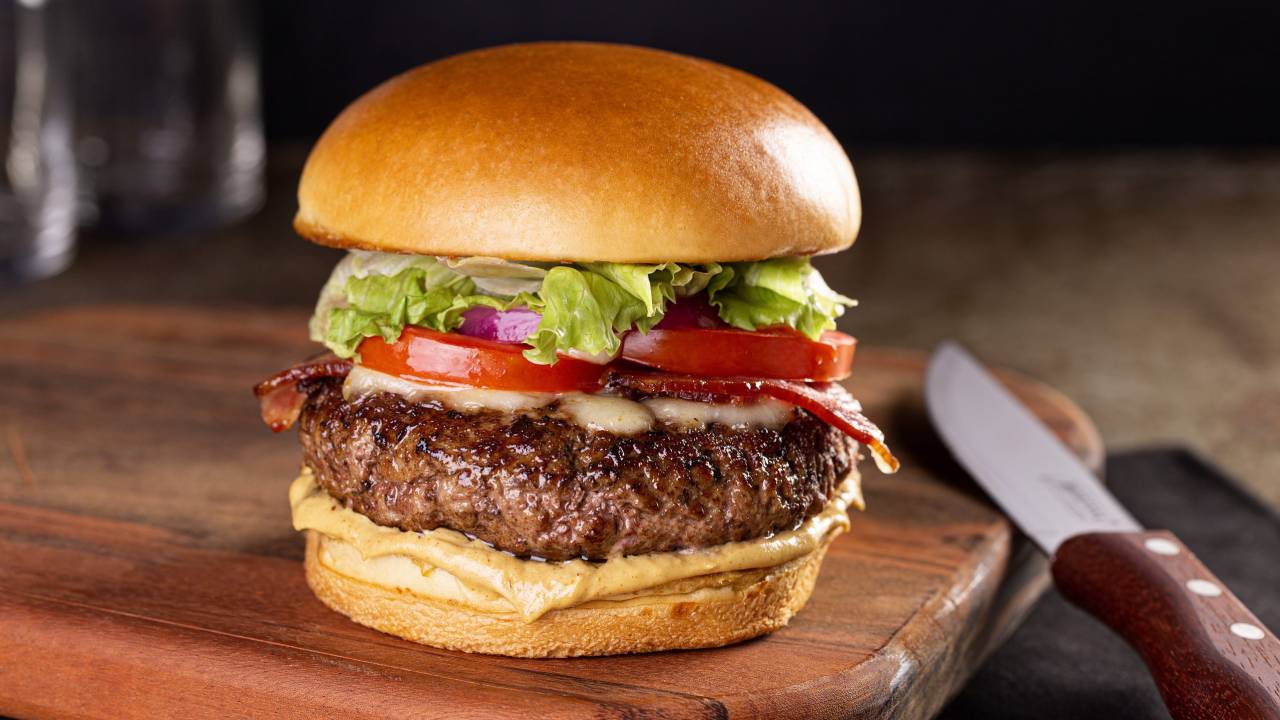 Bland 160g suculento com molho barbecue, queijo, bacon, ingredientes selecionados.